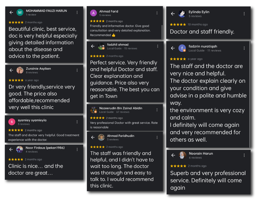 This clinic is managed and operated by Dr. Ahmad Nazhrul’afif bin Mohd Zain, Dr. Azleen bin Alias, and Dr. Nik Ahmad Fadli Husni bin Nik Sharifullah, with the assistance of a dedicated staff comprising qualified nurses and clinical assistants.